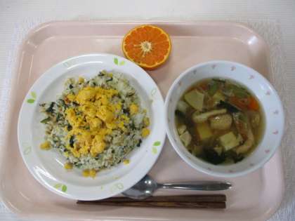 ツナの三色丼 牛乳 吉野汁 くだもの(カラーオレンジ)