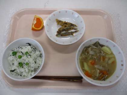 グリンピースとわかめのごはん 牛乳 きびなごのごま揚げ 豚汁 くだもの(カラーマンダリンオレンジ)