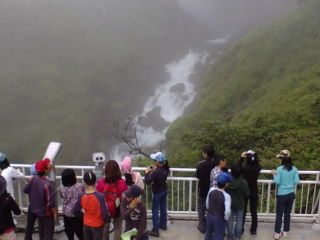 いろは坂をあがってけごんの滝を見学しました。雨量が多く滝はダイナミックですが、残念ながらもやがかかっています。
