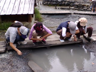 湯元源泉での様子です。霧が晴れていて、よい天気です。気温は20度、ハイキング日和です。