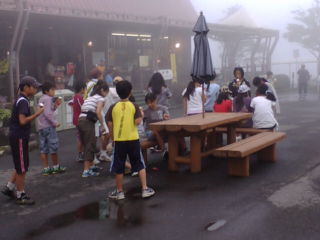 昼食のカレーライスを食べた後、ソフトクリームを食べています。