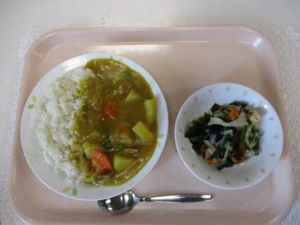 米:山形県 じゃがいも:長崎県 にんじん:千葉県 キャベツ:茨城県 玉ねぎ:愛知県 小松菜:千葉県 セロリ:山形県 グリンピース:ニュージーランド りんご:青森県 生わかめ:徳島県 豚肉:千葉県