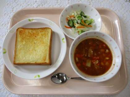 ガーリックトースト 牛乳 ポークビーンズ 野菜のドレッシングかけ