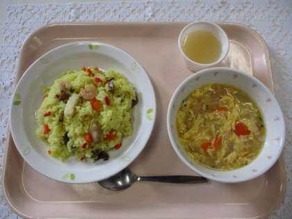 パエリア 牛乳 卵とトマトのスープ ピーチゼリー