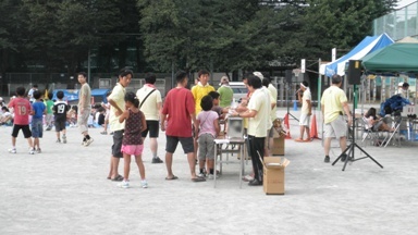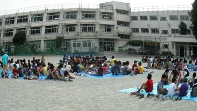 泊まりに参加した子どもたちは校庭で朝食です。普段は食べることのない災害対策用のビスケットとフルーツジュース、それと瀬田町会からいただいたお菓子を食べました。いざというときには、本校の災害用備蓄倉庫にあるこの災害対策用ビスケットで空腹を満たさなければなりません。事前に甘さをおさえた味に慣れておくことは、とても大切です。この後、荷物の片付けをして8時30分から閉会式、9時解散となります。