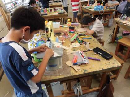 電動糸鋸を使ったり、絵具やペンで着色したり、一人一人のテーマに沿った作品を完成させました。