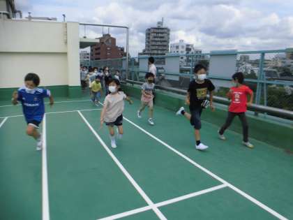 「この長さを10倍した長さが、1kmです。」と、楽しく体を使って、学ぶことができました。