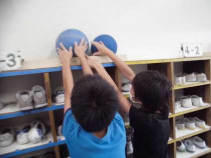 運動委員会は、昇降口の各クラスのボールの空気圧をチェックし、空気を補充していました。これで、安心してボール遊びができます。
