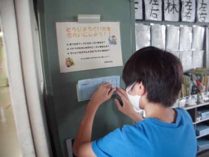 美化委員会は、各クラスの素地ロッカーを点検し、ほうきやちりとりが丁寧に収納されているか、破損がないかなどを確認しています。これは、学校内の美化の推進に一躍買っています。