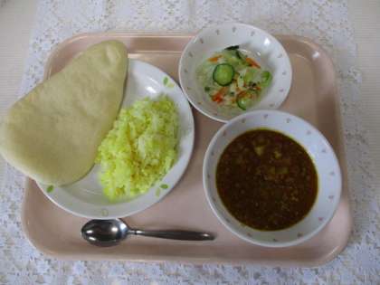 ナン・ターメリックライス 牛乳 キーマカレー 野菜のドレッシングかけ