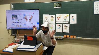 外国語の授業では、学年みんなが同時に授業を受けることを生かして、クラスの垣根を越えて他のクラスの児童と画面越しで交流したり、画面越しでゲームをしたりしてきました。