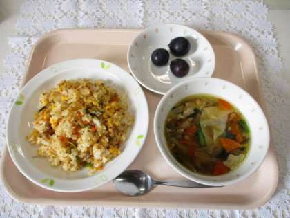 卵入りキムチチャーハン 牛乳 ワンタンスープ くだもの(巨峰)