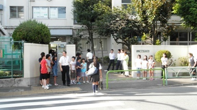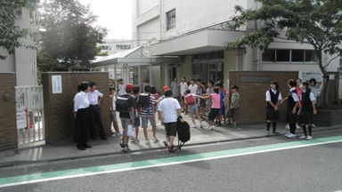 台風の影響で、ぐずついたお天気が続きましたが、今日は青空がのぞくよいお天気となりました。今週から始まった二子玉川小、瀬田小、瀬田中の3校による合同あいさつ運動も3日目になりました。瀬田小学校の正門には、瀬田小の代表委員と瀬田中生徒が、瀬田中の正門には、瀬田中生徒のほかに瀬田小と二子玉川小の子どもたちも参加し、登校してくる生徒に向けて元気が出るあいさつをしていました。