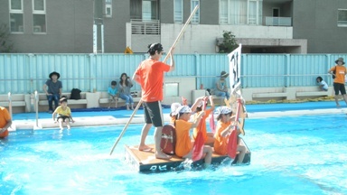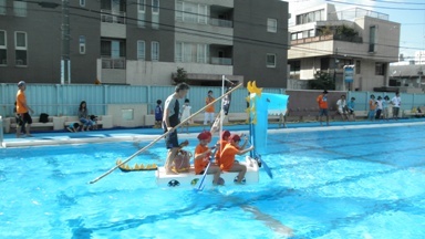 8月28日(日曜日)のアドベンチャーin多摩川が増水のため中止になりました。そこで、プールでの授業が終了した9月10日(土曜日)の午後に、プールでいかだのタイムレースをしました。プールに浮かべたいかだにこぎ手4人の子どもと舵取りの大人1名合計5人が乗床し、力を合わせていかだを前に進めました。風の影響を受けるなど、なかなかうまく前には進まないこともありましたが、みんな楽しく取り組みました。