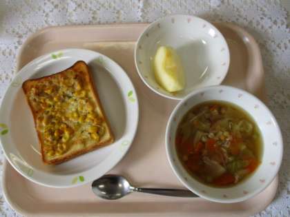 ツナコーントースト 牛乳 スコッチブロス(大麦とレンズ豆のスープ くだもの(りんご)