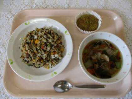 ひじきチャーハン 牛乳 ビーフンスープ おから入りあしたばマフィン