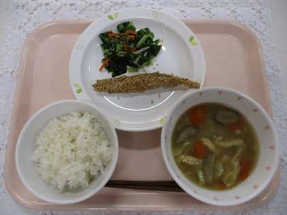 麦ごはん 牛乳 ししゃものごま焼き 呉汁 野菜とわかめのからしじょうゆかけ