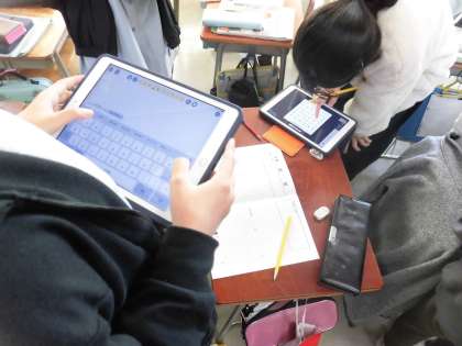 タブレットや旅行雑誌を使って国の特徴を調べたり、写真を貼って国の魅力を伝えたりしています。「どんな写真を貼ったらいいかな?」「その国の観光スポットやおすすめのお土産を紹介したいね。」「みんなが行きたくなるようなパンフレットにしたいね。」など、試行錯誤を重ねながら取り組んでいます。