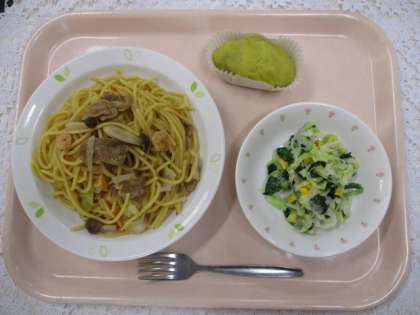 きのこスパゲッティ 牛乳 キャベツとほうれん草のサラダ スイートポテト