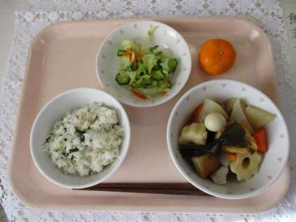 青菜ごはん 牛乳 大蔵大根入りおでん 野菜の甘酢かけ みかん