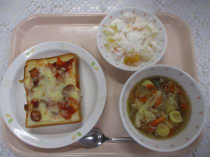 ピザトースト 牛乳 マカロニスープ フルーツヨーグルト
