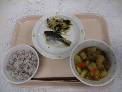 ゆかりごはん 牛乳 あじの塩焼き 鶏とじゃがいものうま煮 野菜とわかめのからしじょうゆかけ