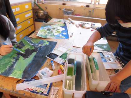 5年生は図工の「ジャングルの生命」という題材で絵の具の学習をしています。