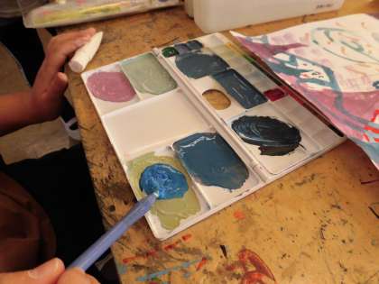赤・青・黄色の三原色と白を使ってたくさんの色をつくって絵を描いています。