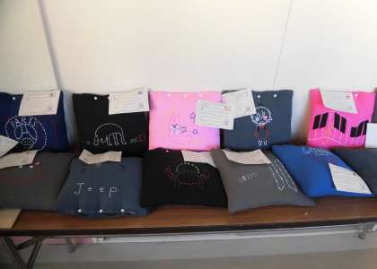 決まった図案と自分で考えた図案を裏表それぞれに刺し子(刺繍)をしてから最後にミシンで縫い合わせています。