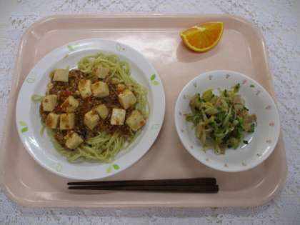 麻婆豆腐焼きそば 牛乳 白菜の中華サラダ くだもの(ネーブルオレンジ)