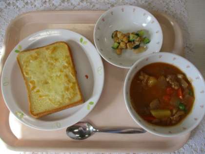 チーズトースト 牛乳 ポークときのこのシチュー ビーンズサラダ