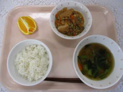 麦ごはん 牛乳 厚揚げのそぼろあんかけ 野菜のみそ汁 くだもの(ネーブルオレンジ)