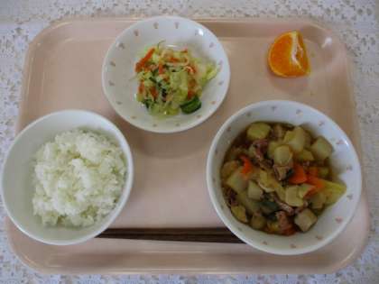 ごはん 牛乳 肉じゃがうま煮 野菜のみそドレッシング くだもの(はるみオレンジ)
