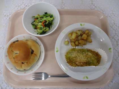 ぶどうパン 牛乳 魚のパン粉焼き ポテトフライ 海藻サラダ