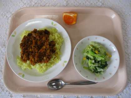 レンズ豆入りドライカレー 牛乳 キャベツとほうれん草のサラダ くだもの(せとか)