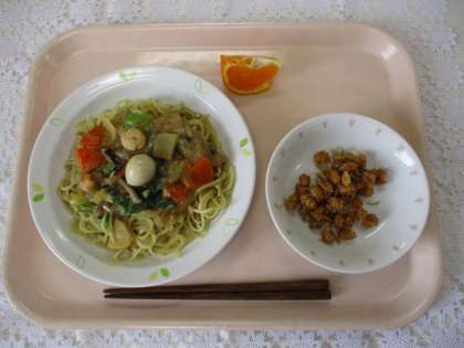 五目あんかけそぼ 牛乳 大豆とじゃこの甘辛揚げ くだもの(はるみ)