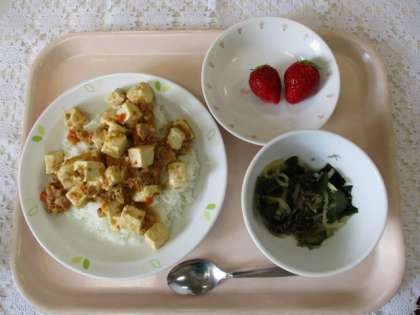 麻婆豆腐丼 牛乳 じゃこサラダ くだもの(いちご)