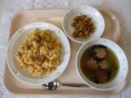 キムチチャーハン 牛乳 ビーフンスープ 大豆とじゃこの甘辛揚げ