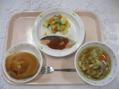 ぶどうパン 牛乳 鮭のバーベキューソース ジャーマンポテト きのこと野菜のスープ