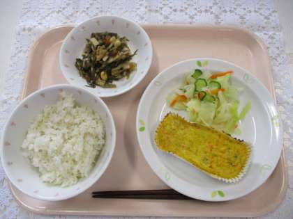 麦ごはん 牛乳 卵焼き 豆入りきざみこんぶの五目煮 野菜の甘酢かけ