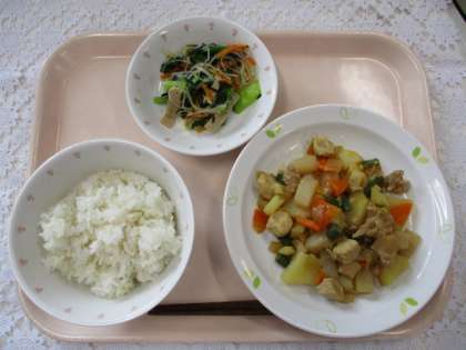 米:山形県 じゃがいも:鹿児島県 玉ねぎ:北海道 にんじん:徳島県 小松菜:埼玉県 さやいんげん:沖縄県 鶏肉:宮崎・茨城・栃木県