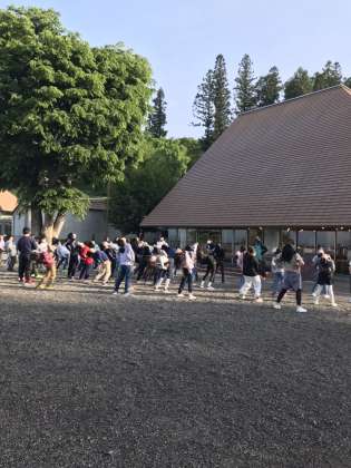 朝会で、気持ちの良い空気を吸ったあと、ラジオ体操で眠気もスッキリ!