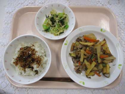 米:山形県 じゃがいも:鹿児島県 にんじん:千葉県 ごぼう:熊本県 さやいんげん:千葉県 もやし:栃木県 小松菜:東京都 たけのこ:福岡・熊本・鹿児島・宮崎県 ちりめんじゃこ:タイ 豚肉:千葉県