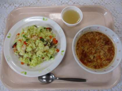 パエリア 牛乳 卵とトマトのスープ ピーチゼリー