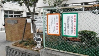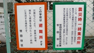 正門のネムノキ近くの金網フェンスに世田谷区から防災に関する看板があります。「この学校は避難所です」の看板には、瀬田小が災害時の一時避難場所であることが書かれています。もう1枚の「震災時一時集合所」には、災害時のときは、地域の皆さんの安全確認や一時避難場所であることが記されています。また、火災延焼の際は、広域避難場所への移動を呼びかけています。近くにある広域避難場所は、都立園芸高校、玉川野下町公園、多摩川河川敷田園調布先一帯、多摩川河川敷・二子橋一帯、砧公園・大蔵運動公園一帯などです。いざというときの避難場所について家族で話し合っておきましょう。