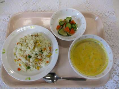 三色ピラフ 牛乳 キャロットポタージュ シャキシャキ野菜