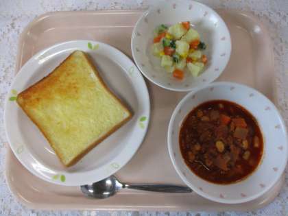 ガーリックトースト 牛乳 チリコンカン マセドアンサラダ