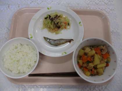 米:山形県 じゃがいも:鹿児島県 玉ねぎ:兵庫県 にんじん:千葉県 さやいんげん:茨城県 キャベツ:茨城県 きゅうり:岩手県 ししゃも:カナダ 豚肉:千葉県
