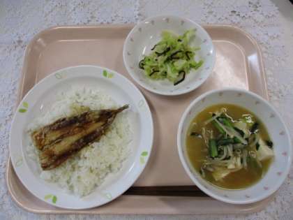 麦ごはん 牛乳 いわしのかば焼き 野菜と豆腐のみそ汁 キャベツの塩昆布かけ