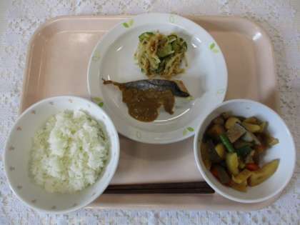 ごはん 牛乳 魚のごまだれかけ いりどり煮 切干しときゅうりの甘酢あえ